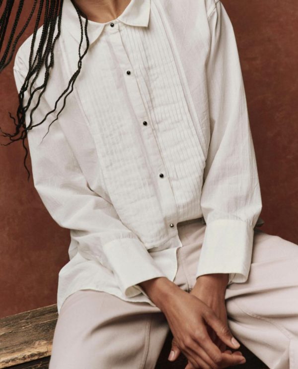 Based in a dressed-up classic, this cotton button up is intentionally oversized with authentic details like a pleated bib Back yoke, tiny onyx and silver buttons, tailored shirt cuffs and a dramatic shirttail hem.
