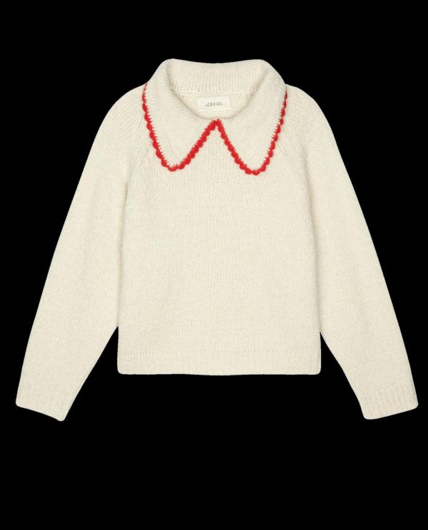 This slightly shrunken pullover sweater is knit in a textured and super soft alpaca blend that creates a lofty and warm feel. It features a prominent knit collar that is adorned with a delicate contrast crochet scallop trim. The set- in sleeves and easy fit make this sweater perfect for layering or wearing on its own.