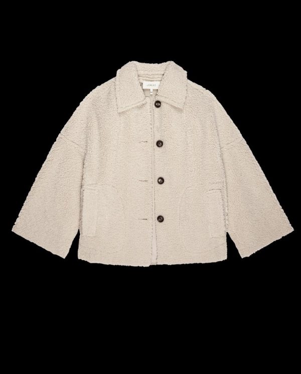 Cut from natural colored bonded fleece fabric that’s plush on one side and soft and smooth on the inside, the coat is inspired by a clean cut 1950’s silhouette with dropped shoulders, angled armholes, cropped length, collar, welt pockets, and sophisticated horn buttons up the front. All seams are cut and finished with a pinked micro-zigzag edge.
