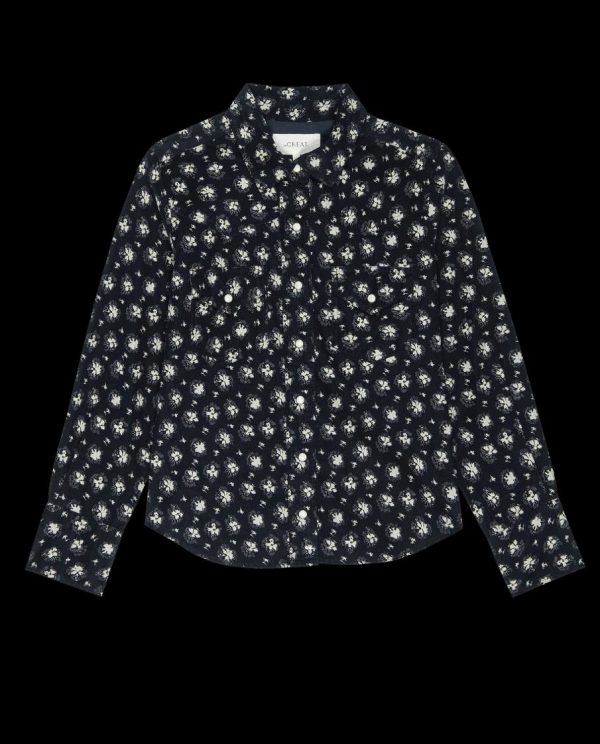 The Howdy Top is our take on the classic Western shirt reimagined in shrunken proportions. Its boxy fit features a shirt collar, front placket with pearlized snap closures. western yoke details, wide sleeve cuffs, and a slight shirttail hem. Crafted in printed baby wale cord it has a soft, warm hand feel.
