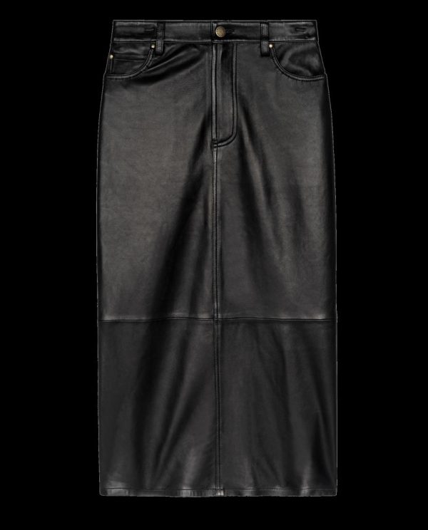 This fitted and long silhouette fits snug through the hips and straight through the body, with a back yoke and classic denim double stitching. Updated for the festive season in a soft leather, the fit sits just below the waist and hits above the ankle with a slit up the center back body finished with a bar tack. Classic five-pocket details include a zip fly with metal button waist opening, finished with scoop pockets at the front and back patch pockets at the back.