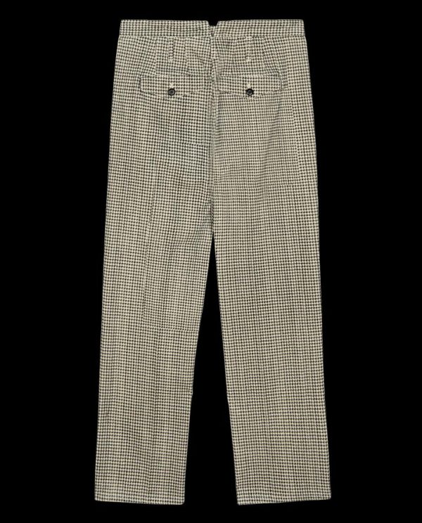 Made of a vintage inspired cotton corduroy with a mini houndstooth print it is washed and worn for the soft and faded look we love. It’s relaxed fit sits just below the waist with a straight and easy leg with vintage men’s trouser details including deep front pleats, button fly with interior fly extension, side seam pocket, contrast black corozo buttons, back welt pockets with delicately curved pocket flaps, thoughtfully lowered belt loops that when belted waist band is still exposed, allows you to paper bag the waist.