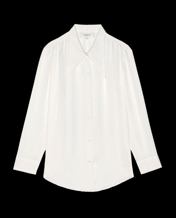 This button up top has a relaxed menswear inspired fit with an oversized pointed collar referencing favorites from the 1970s.