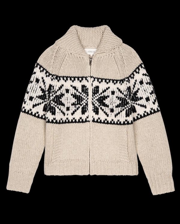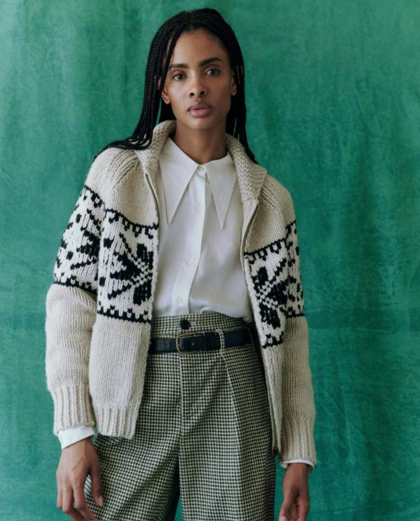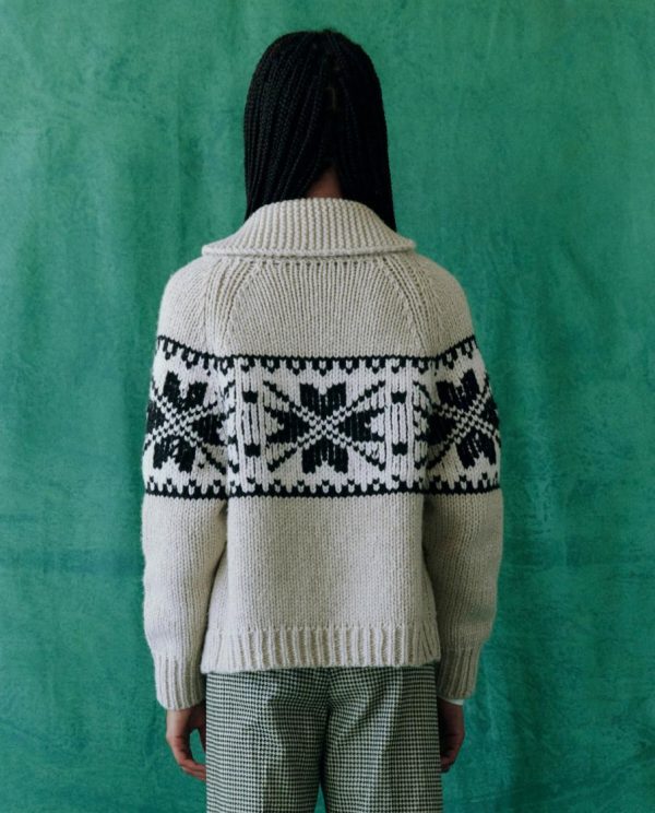 Inspired by traditional Norwegian knitting, The Woodshed Cardigan is made from a thick, super soft lambswool yarn with a graphically placed snowflake motif.The classic raglan sleeve cardigan fits easy and straight through the body and sleeves, with a cozy shawl collar, and a chunky metal zip closure.